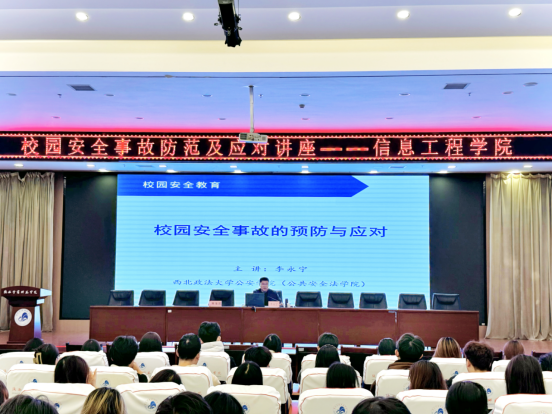 为切实增强新生的安全防范意识和自我保护能力,营造安全、和谐、稳定的校园环境,信息工程学院于10月20日在图书馆报告厅,开展“校园家全事故防范及应对”主题新生安全教育讲座。讲座特别邀请了西北政治大学公安学院(公共安全法学院)党委书记李永宁主讲,院党委副书记常海滨同志主持,全体2025级新生辅导员及全体新生参加。