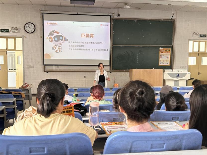 宣讲活动中,核桃编程西安校招负责人王凝老师以“开启C位人生”为主题,着重讲解了核桃编程此次针对信息工程学院在C++和Python等编程语言方面灵活运用的同学所开设的专场招聘宣讲的详细情况。她从C++和Python等编程语言灵活运用的程度要求、公司简介、公司晋升空间、待遇、福利、工作环境等方面进行了详细介绍。