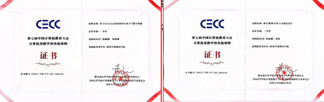 近日,第七届中国计算机教育大会(CECC)在厦门举行,我院教师团队申报的《基于DCGAN深度模型生成手写数字图像》《新生数据分析与可视化设计》两项案例在大会组织的“计算机类教学和实验案例”评选活动中分别荣获一等奖、二等奖。
